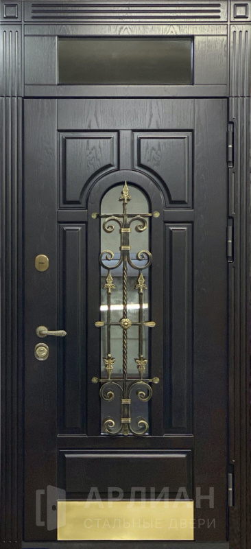 Высокая парадная дверь с фрамугой стеклом и ковкой №36