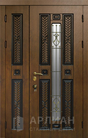 Полуторная входная дверь с элементами ковки и стеклом №72